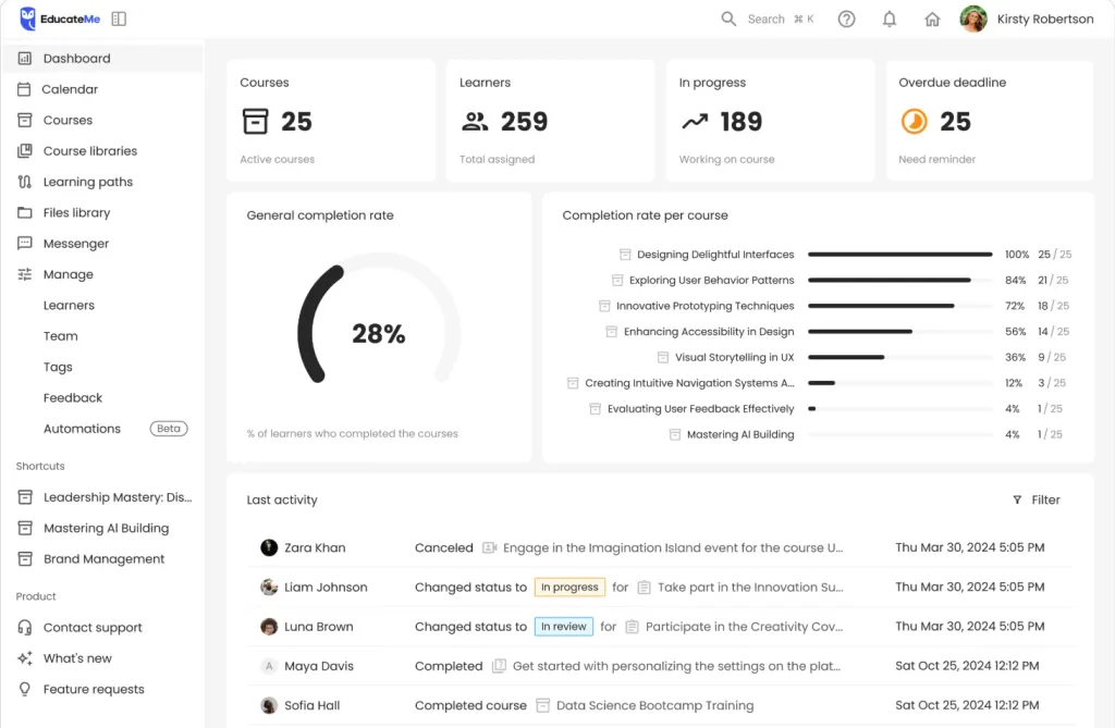 You won’t just be able to track learner progress through the course material, but also get a bird’s-eye view across other company workflows that the LMS is integrated with.