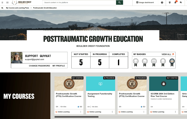 The impact of BCF’s eLearning initiative has been significant. Within the first few months of release, the Posttraumatic Growth in Practice (PTGIP) course has seen 174 enrollments, with 41 course completions, receiving a 5-star learner rating, highlighting the program’s transformative impact. Equally, their Posttraumatic Growth Certification (PTGC) course has seen 120 enrollments, with 21 course completions within the first 3 months after launch, ensuring learners are better equipped to steer clients towards hope and possibilities beyond PTSD symptom reduction.