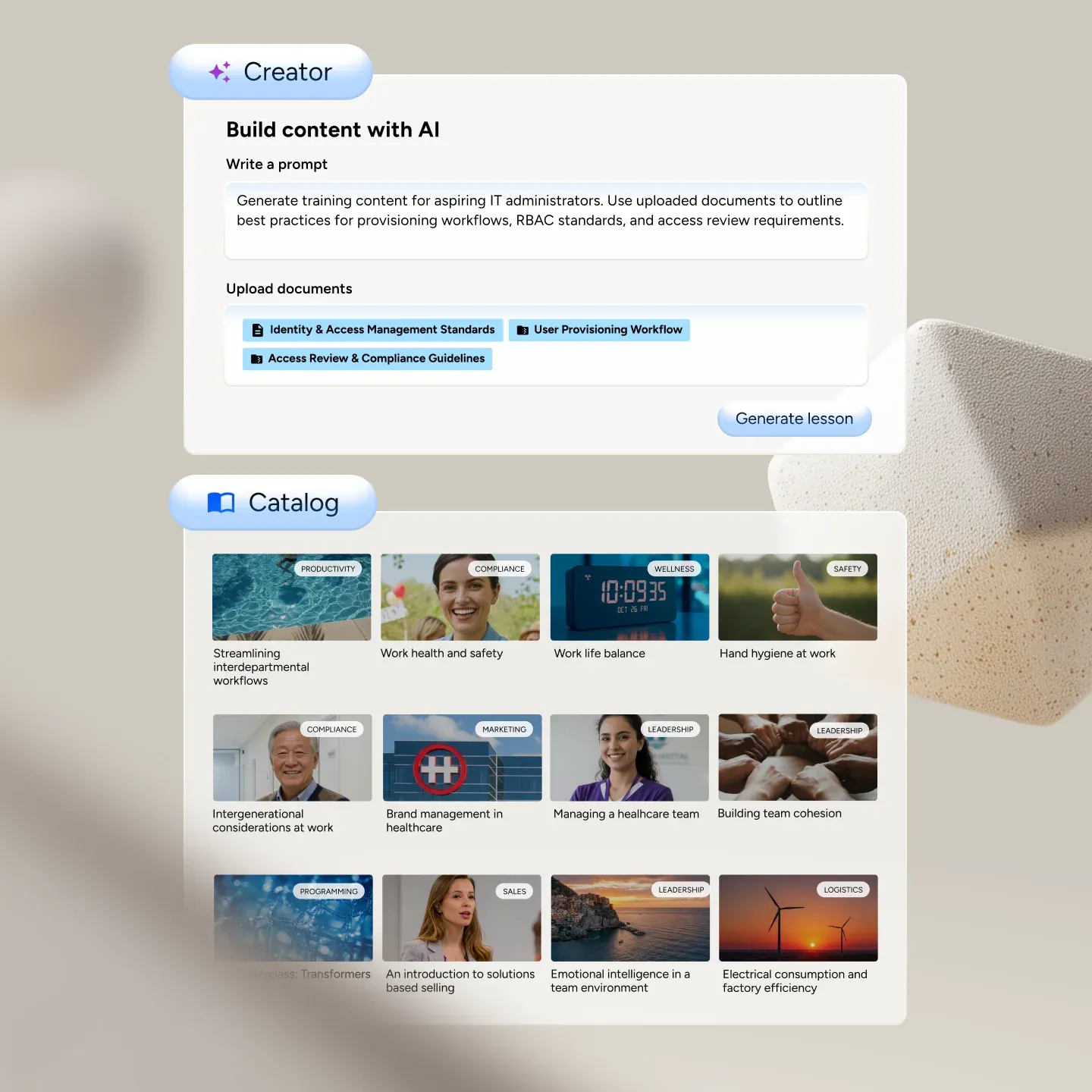 Ja. Über unseren Content-Marktplatz stehen mehr als 40.000 Kurse zur Verfügung, darunter Compliance-Schulungen, Diversity & Inclusion, berufliche Weiterentwicklung von Mitarbeitenden und spezialisierte Kurse wie medizinische Ausbildung über Elsevier. Ergänzt wird dies durch KI-gestützte Inhaltserstellung, mit der Sie eigene Inhalte erstellen und kuratieren können – alles, was Sie für Ihre Bildungsanforderungen benötigen.