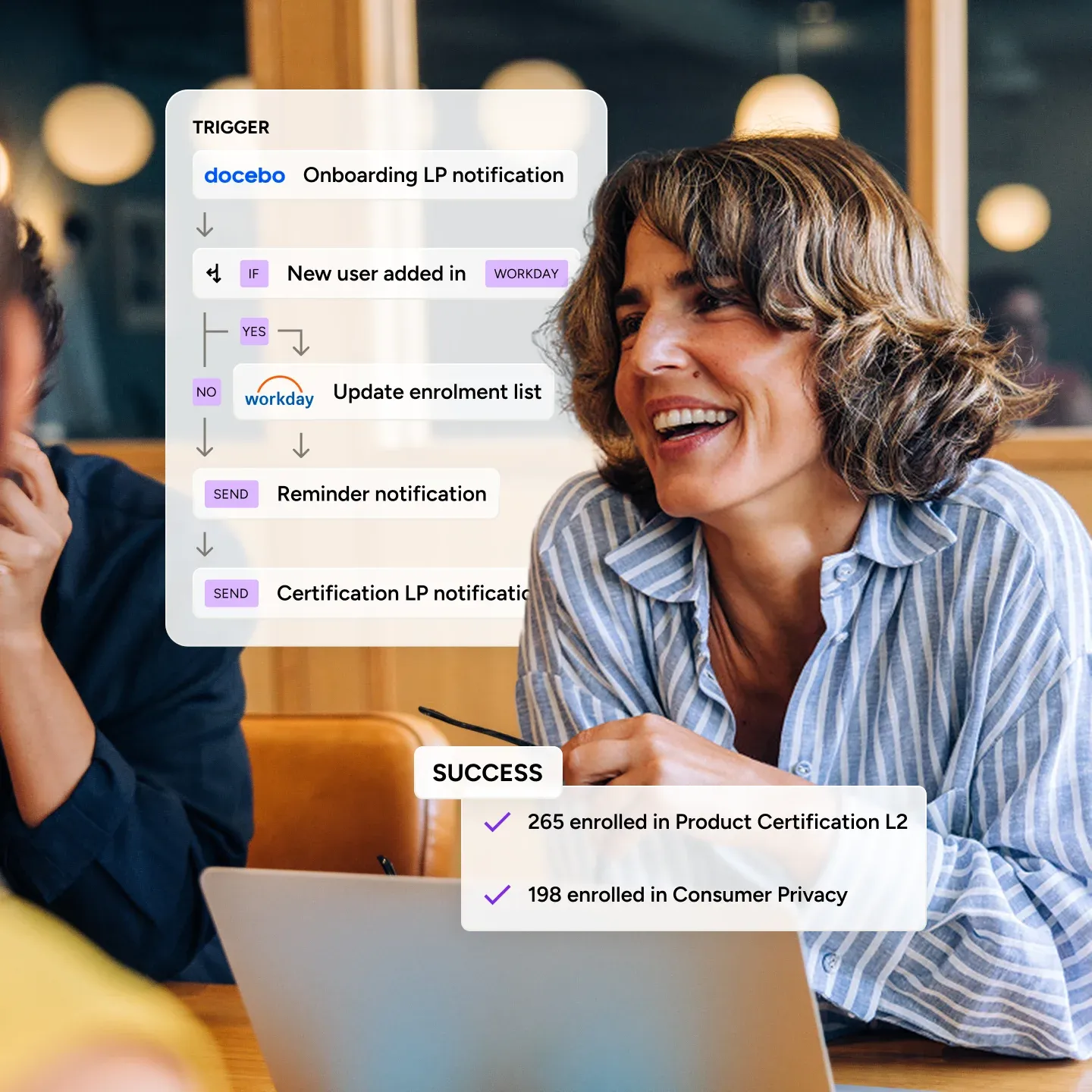 Track progress, attendance, and engagement all in one place. Docebo’s analytics show who’s thriving, who needs support, and how onboarding impacts retention and performance.