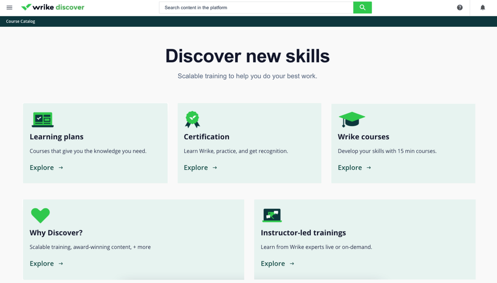 Avec Docebo, Wrike Discover a été configuré pour offrir une expérience d’apprentissage complète et immersive à ses clients.