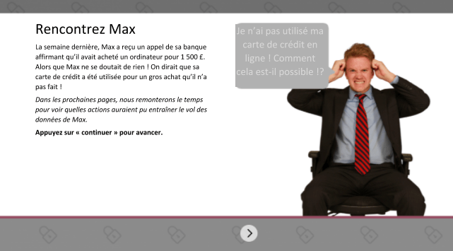 Dans le cours « Prévention de la fraude », les élèves passent à l’étape suivante du cours s’ils réussissent à relever correctement un défi. Les élèves devront faire face à différents rebondissements jusqu’à ce qu’ils atteignent le résultat souhaité. Le jeu établit un score et ajoute des règles pour permettre aux élèves de se déplacer à l’intérieur du cours.