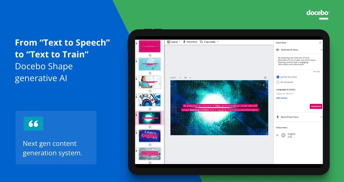 Les développeurs de contenu L&D feraient bien de comprendre comment ils pourraient tirer parti de ces outils pour améliorer (et non remplacer) leur production. Au cours du webinaire, le CPO et co-fondateur de Docebo, Fabio Pirovano, a donné une rapide démonstration de Docebo Shape – une solution qui permet aux utilisateurs d’accélérer le contenu de formation et de développement à l’aide d’outils d’IA.