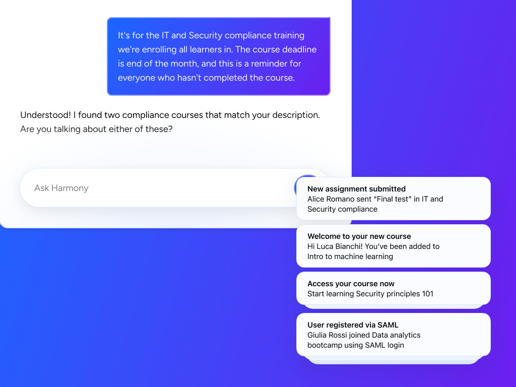 Les plateformes learning sont censées aider. Mais la plupart d’entre elles enterrent le contenu, compliquent les flux de travail et transforment les administrateurs en pompiers. Harmony répare ce qui est cassé, avec une IA intégrée au cœur du système. Moins de tâches inutiles. Plus de learning.