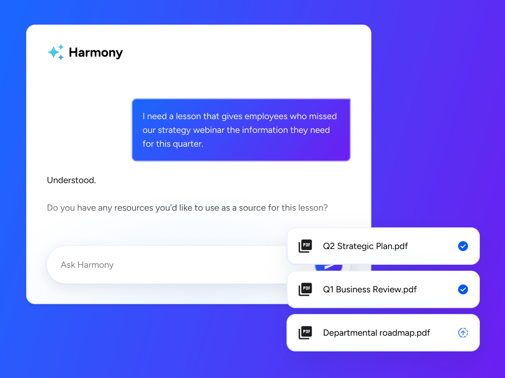 Harmony commence par la recherche, mais évolue pour devenir votre copilote IA tout-en-un pour l’ensemble de votre expérience de formation.