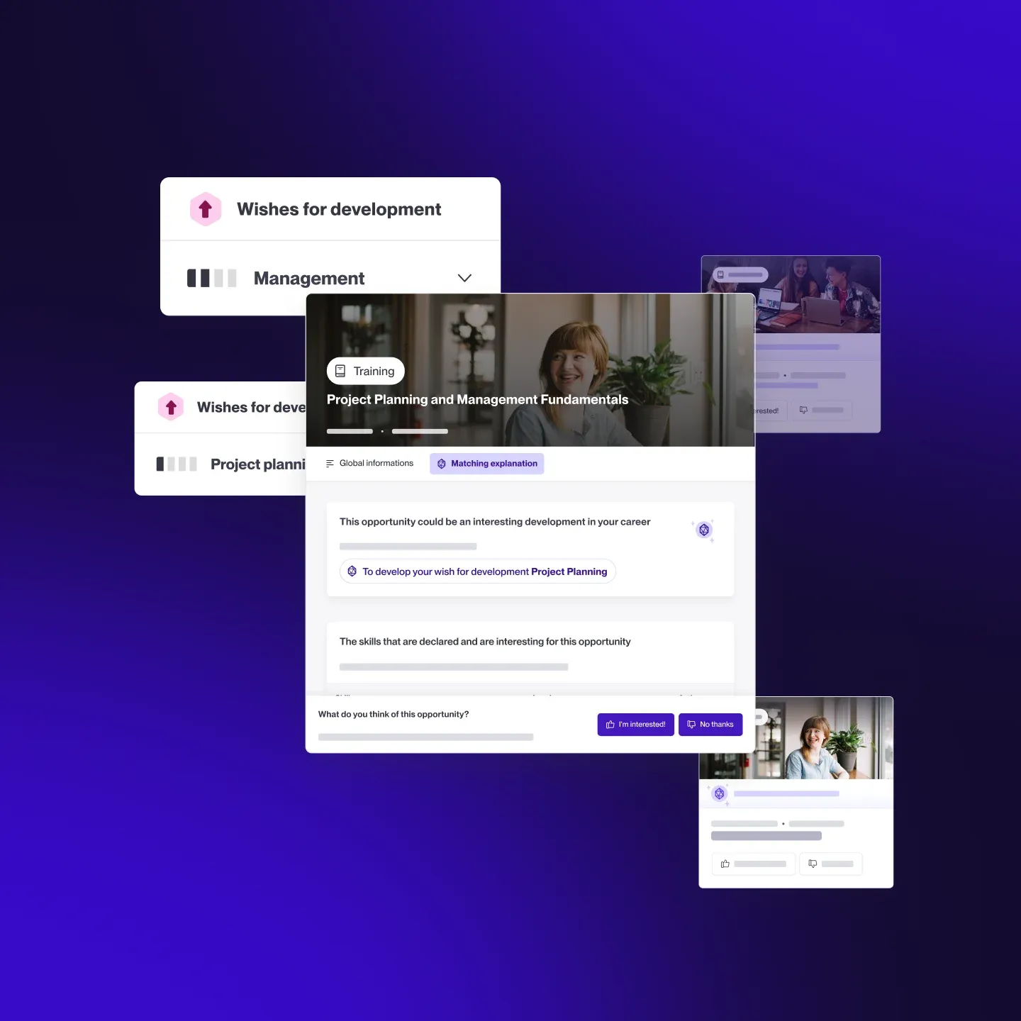 Associez les individus à des rôles, des projets et des opportunités sur la base de compétences vérifiées, et non de CV ou d’intitulés de postes. Redéployez les talents en interne, réduisez les coûts de recrutement externe, et continuez sur votre lancée lorsque les priorités changent.