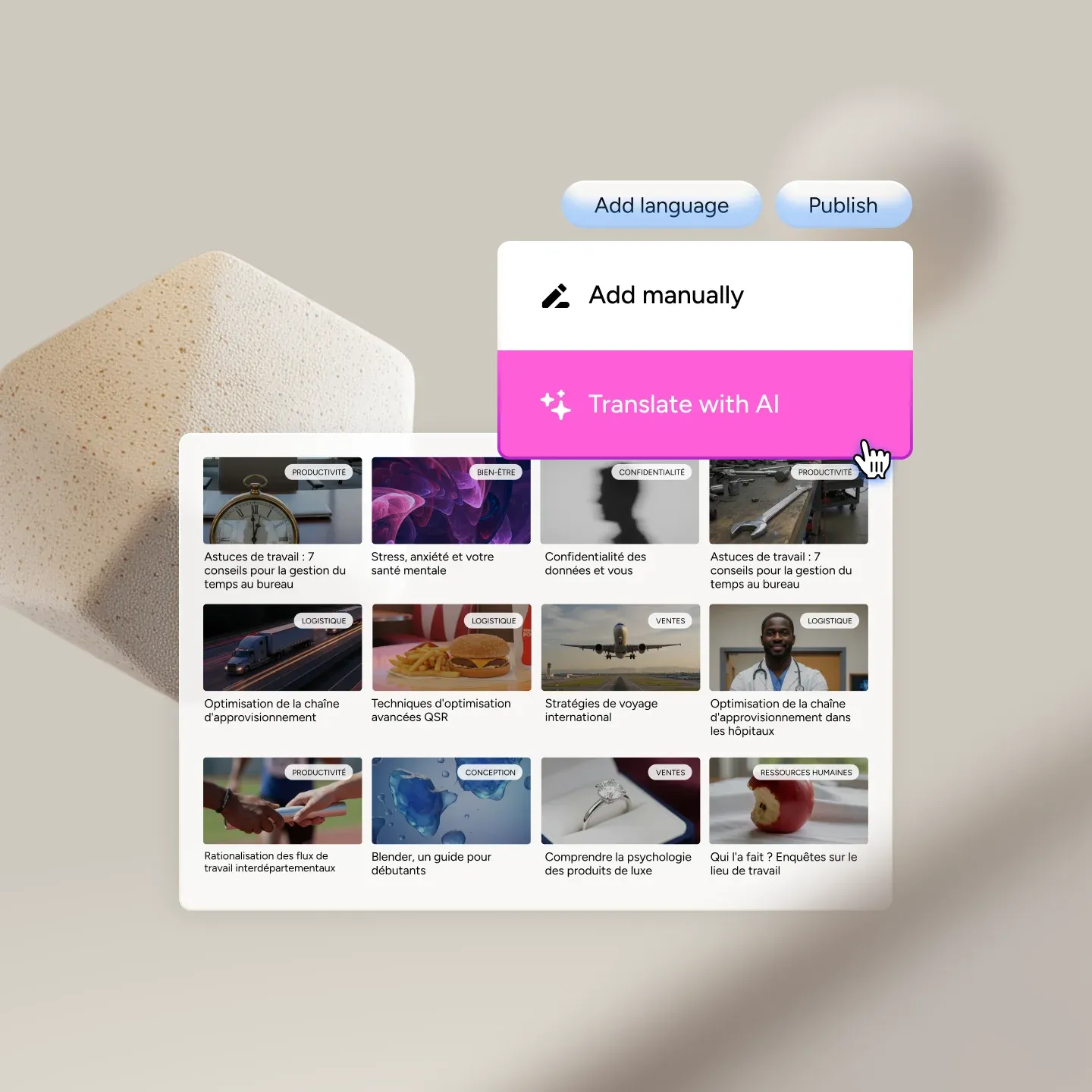 Offrez une formation dans n’importe quelle langue grâce à des capacités intégrées de traduction et de contextualisation, et à des programmes évolutifs couvrant tous vos établissements.
