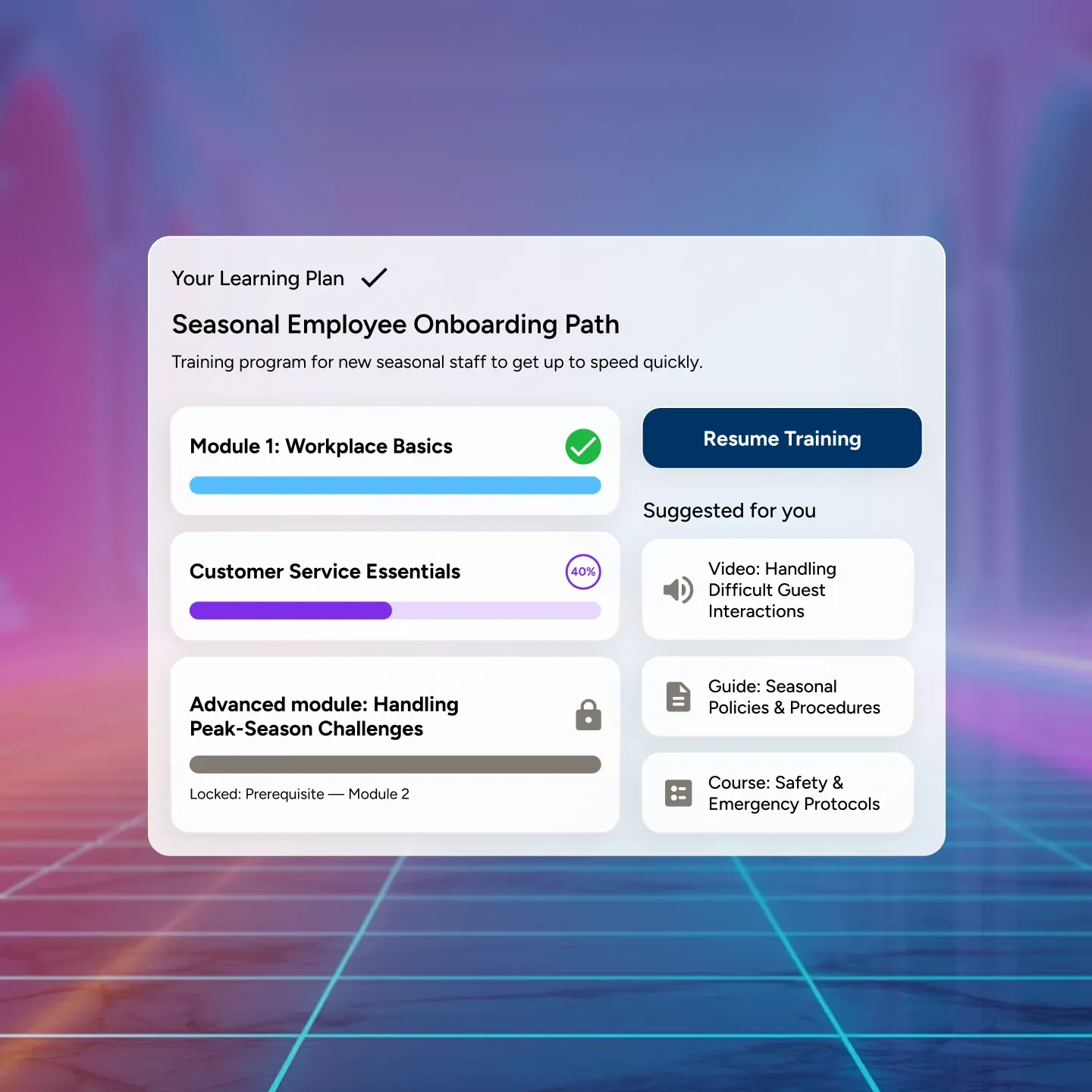 Recherchez des capacités multilingues, une marque personnalisable pour l’industrie du luxe, l’évolutivité pour la gestion de la main-d’œuvre saisonnière, la gamification pour l’engagement, des parcours d’apprentissage basés sur les rôles pour le développement professionnel, et des capacités de déploiement global pour les opérations hôtelières internationales.