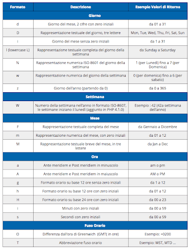 A questo punto, inserisci il tag formato [date_complete] e digita il giorno, la settimana, il mese, l’ora e il fuso orario in lettere. Fai riferimento alla tabella che segue per ulteriori informazioni riguardo le lettere corrispondenti a giorno, settimana, mese, ora e fuso orario: