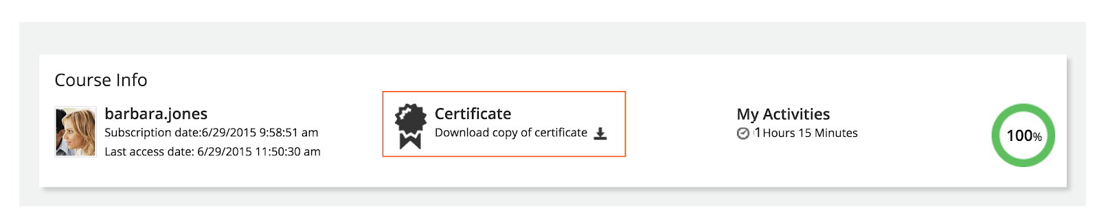 Se il tema della piattaforma è il tema 6.9, gli utenti possono scaricare il proprio certificato dal widget Scheda Corso (se configurato) dalla pagina del corso, premendo Scarica una copia del certificato. Ricorda che il widget Scheda Corso è disponibile solo per il tema 6.9.