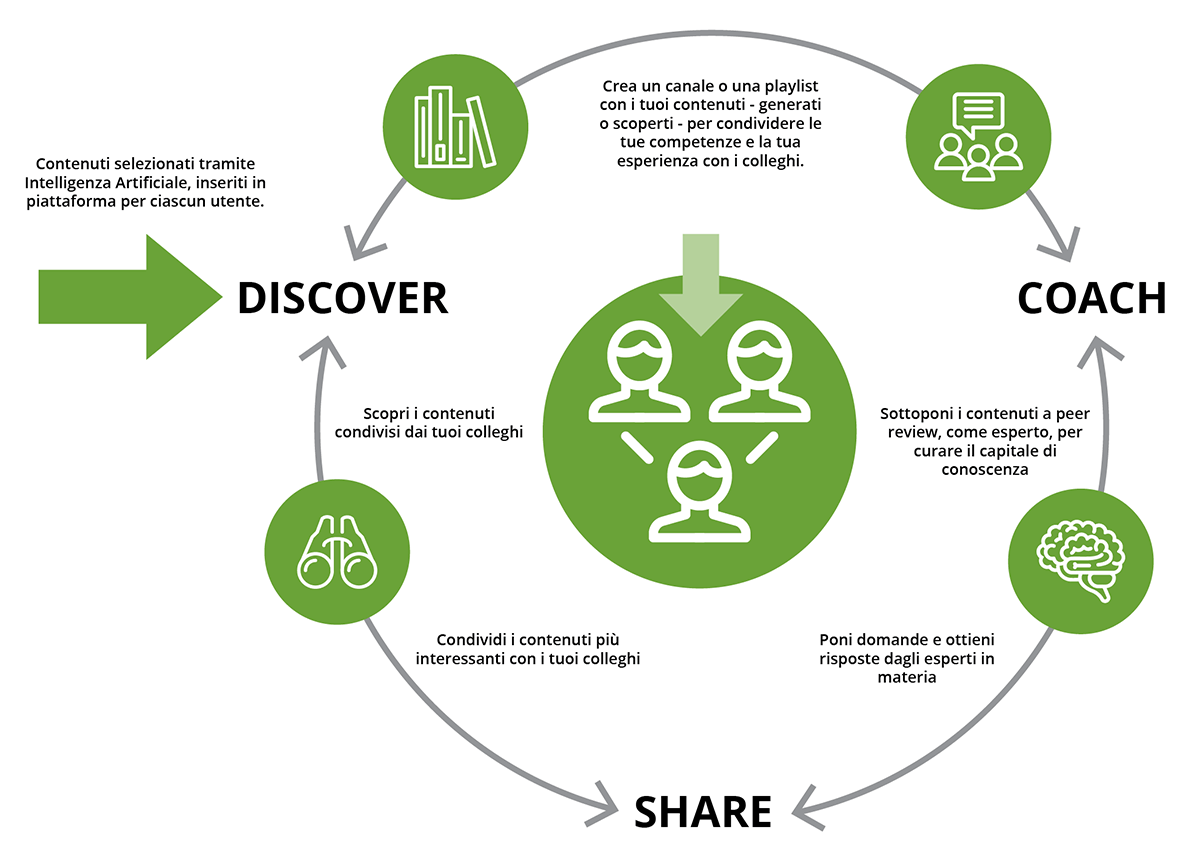Discover, Coach & Share offre contenuti personalizzati ai tuoi utenti, permettendo loro di condividere le proprie conoscenze in tutta l’organizzazione. Inoltre, mette in evidenza i tuoi esperti in materia, che potranno rispondere alle domande e condividere le loro competenze in tutta l’azienda.