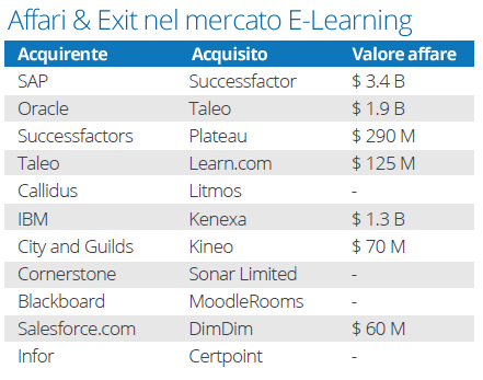 Nel 2012 abbiamo osservato un vero e proprio boom di investimenti legati alle tecnologie per la formazione e nel mese di settembre dello stesso anno si è registrato l’investimento più ingente nel settore, quando cioè Desire2Learn, fornitore globale di soluzioni E-Learning, ha ricevuto una cifra pari a 80 milioni di dollari da parte di un fondo di investimento privato.