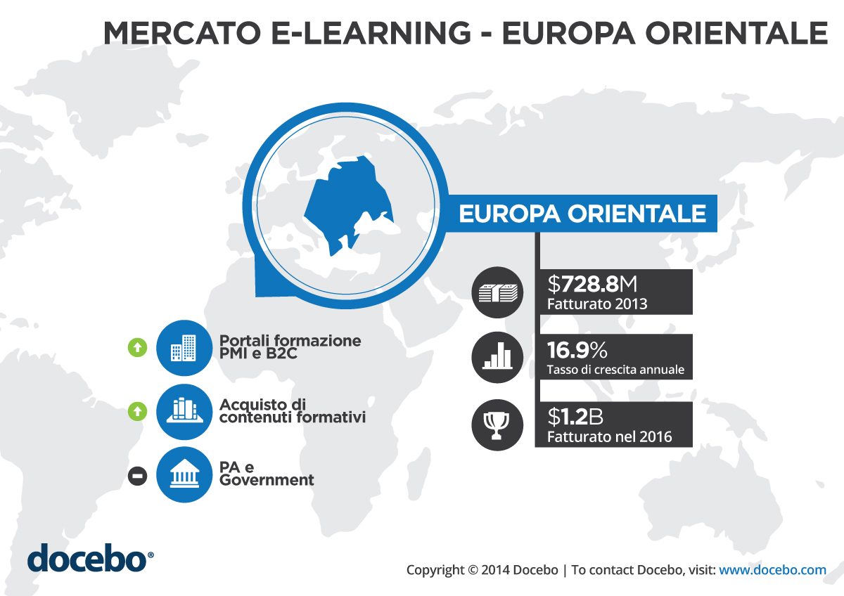 Infografica: trend e previsioni relative al Mercato E-Learning in Europa Orientale, dove i maggiori player sono Grandi Aziende (che acquistano contenuti didattici) e portali di formazione PMI e B2C.