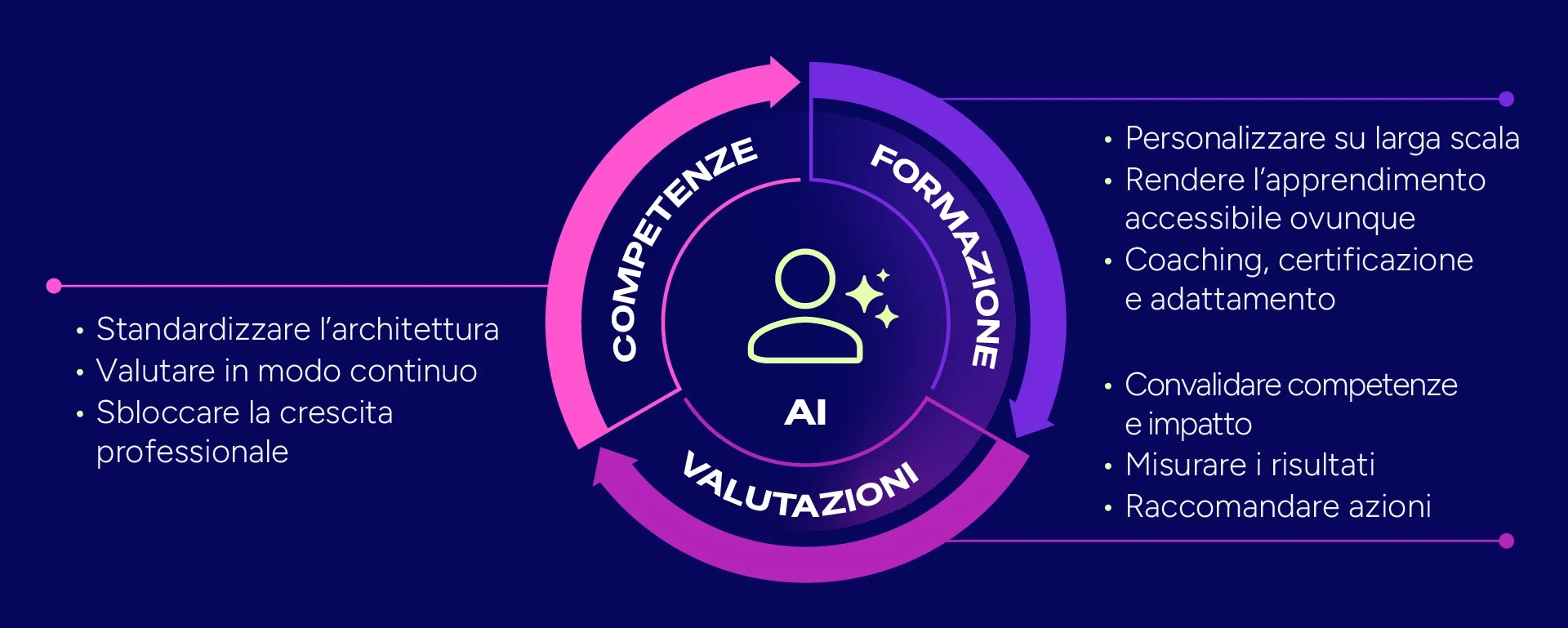 L’AI fa il lavoro pesante in background: mantiene le competenze aggiornate, attiva apprendimento e azioni organizzative, valida i progressi nel tempo. In questo modo l’esecuzione non dipende più da coordinamento manuale o sforzi continui.