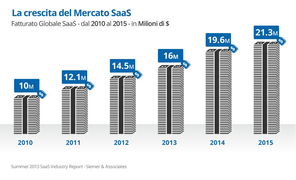 Secondo le previsioni di Gartner, per tutto il biennio 2014-2015, il SaaS continuerà ad avere un trend di crescita molto sostenuto, arrivando a toccare i 22 miliardi di dollari di ricavi.