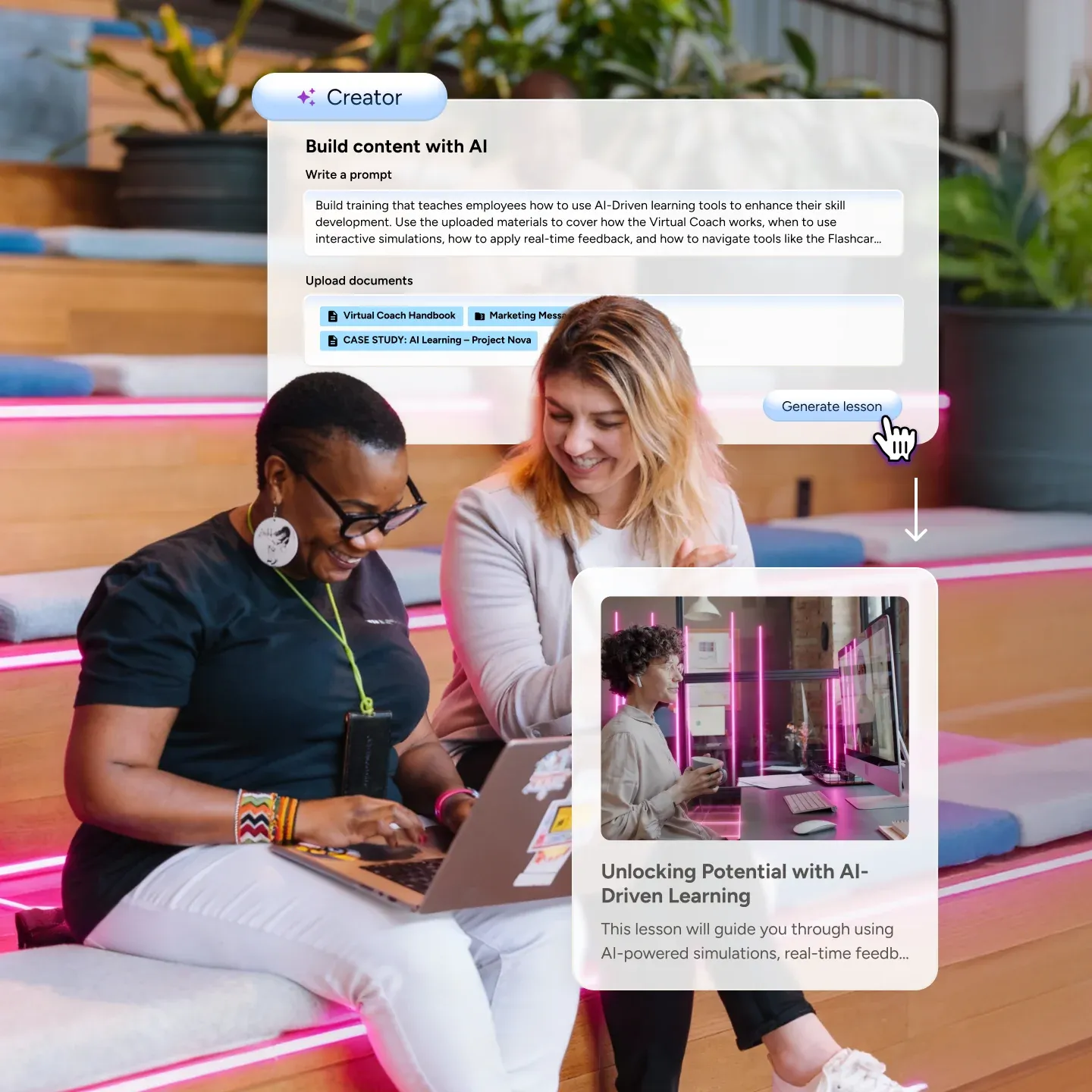 Genera corsi interattivi in pochi minuti o ispirati a risorse di altissimo livello. Il tutto ottimizzato per formazione e crescita.