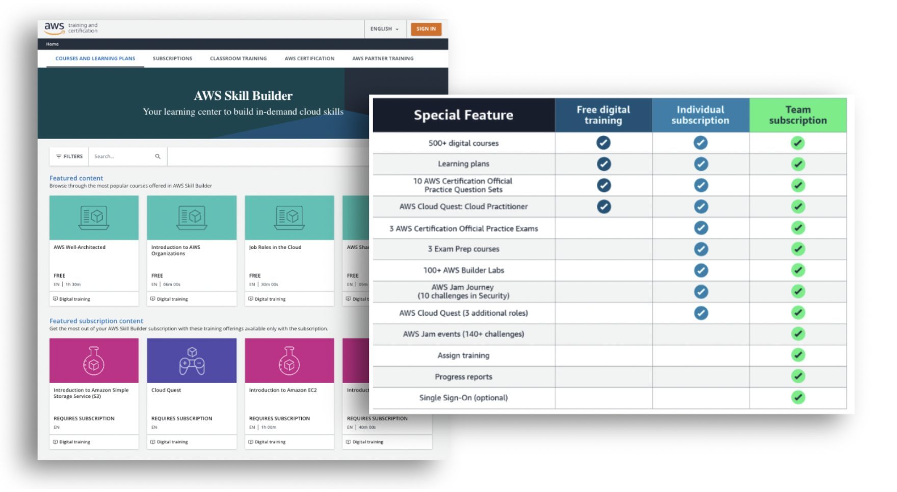 This is what Docebo’s customer Amazon did with their recently launched AWS Skill Builder, an online learning center with hundreds of cloud computing courses. Users have access to limited features at no cost with the option to upgrade to an individual or team subscription (on a monthly or annual basis) to gain access to more features (like practice certification exams) and more advanced courses.Â