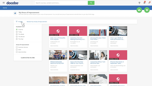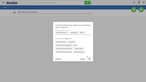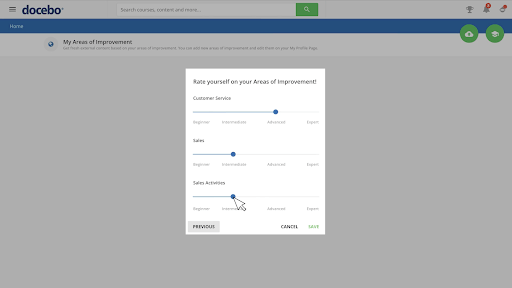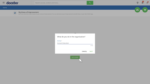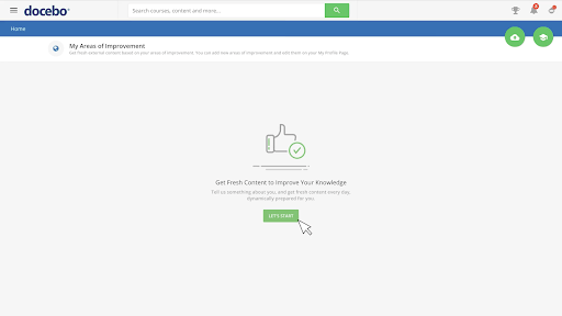 Learners will be invited to use Docebo Discover or can get started by going to the “My areas of improvement” section from their menu.