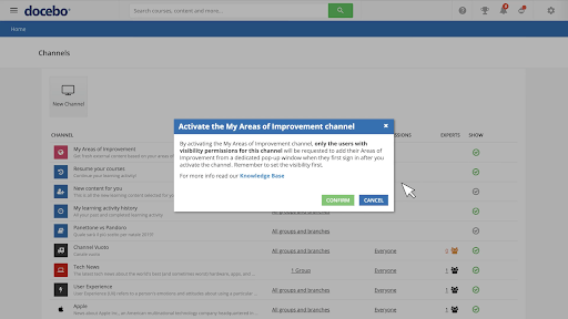 For Docebo Learning Platforms with the Coach & Share module, Docebo Discover can be activated by admins by finding the “My Areas of Improvement” tab within the Channel section in your menu.