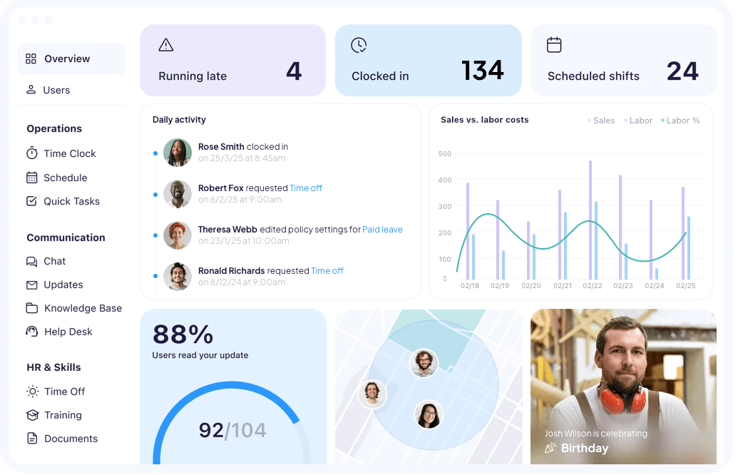 A single app combines onboarding, microlearning, scheduling, time clocks, and chat. It’s purpose-built for industries like retail, healthcare, construction, and field services—anywhere employees are on the move.