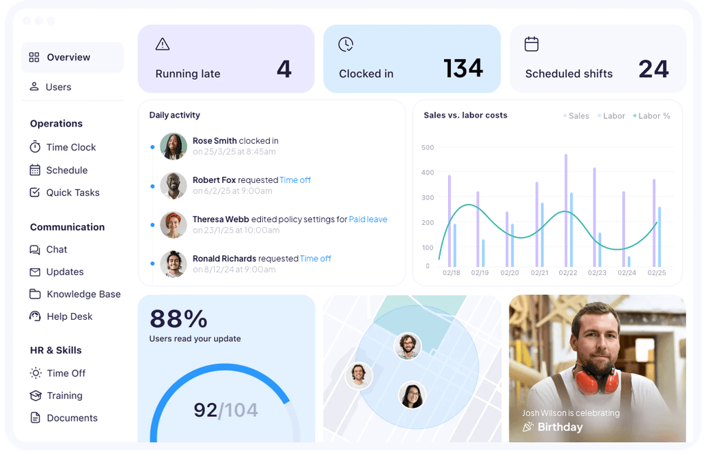- Workforce management features like scheduling, time tracking, and task management