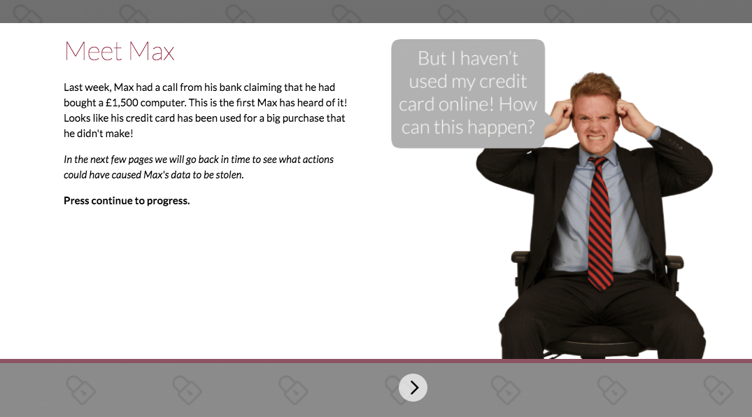 In Preventing Fraud, learners jump to the next course stage if they respond correctly to a challenge.