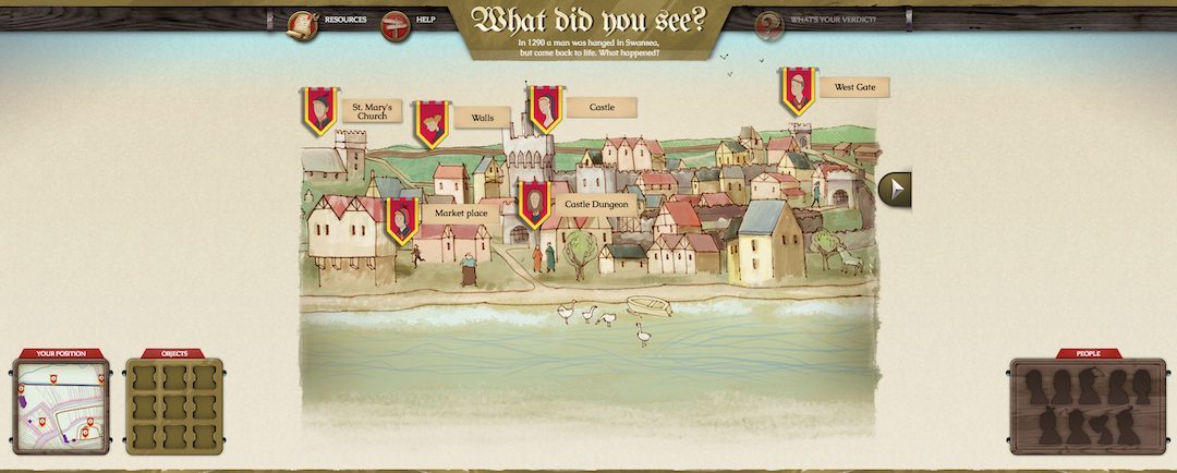 Let’s look at another example that makes learning a challenge. The interactive historical game Medieval Swansea has learners take on the role of a detective to solve a mystery.