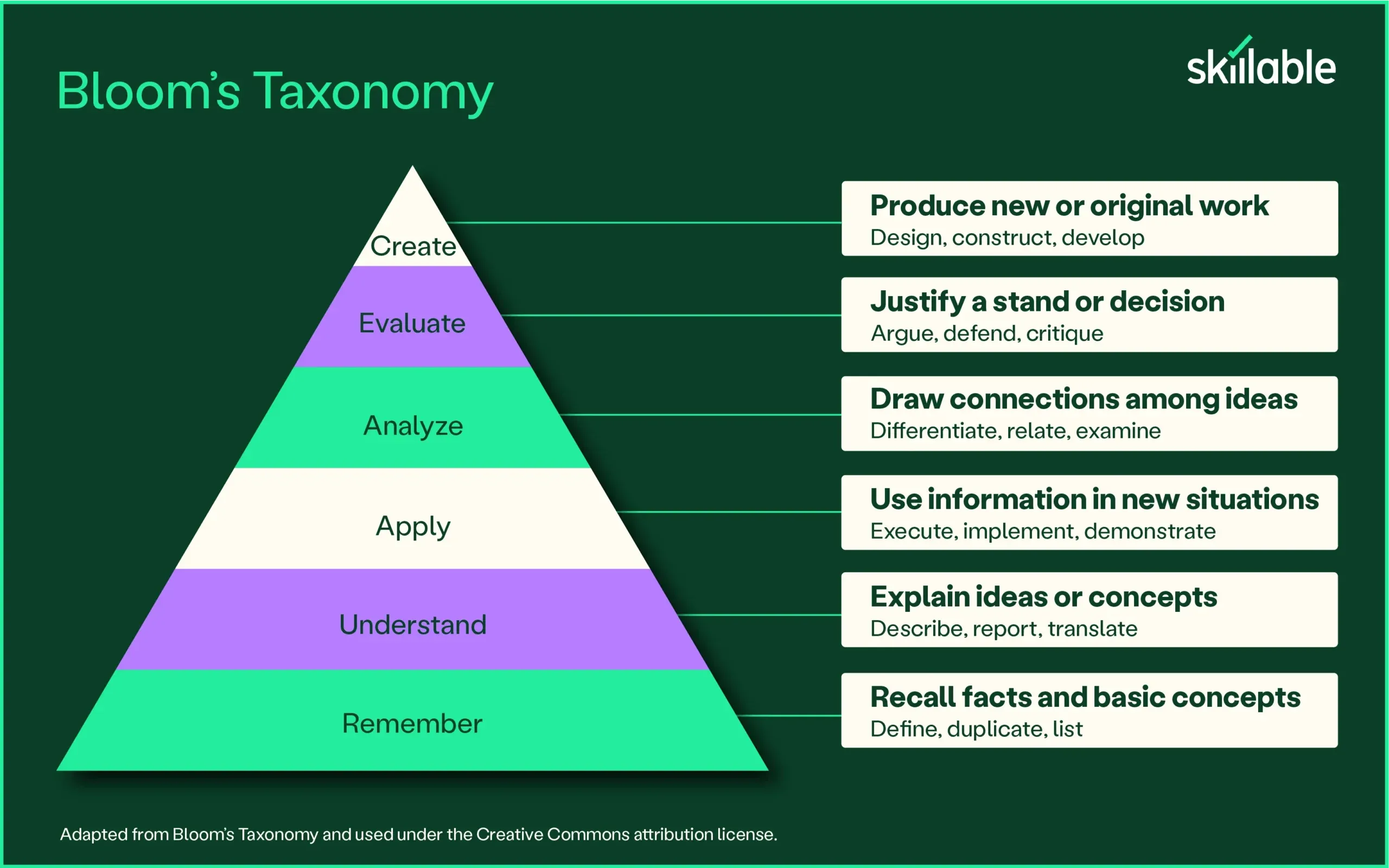 Bloom’s Taxonomy helps instructors to organize learning objectives according to complexity, from psychomotor to cognitive. In the AI era, many AI agents are taking on the lower levels of the pyramid (Remember and Understand) which places greater emphasis on human workers to carry out higher-cognitive tasks such as analyzing, evaluating, and creating. This shift in activities needs to be reflected in the learning and practice environments provided to learners.