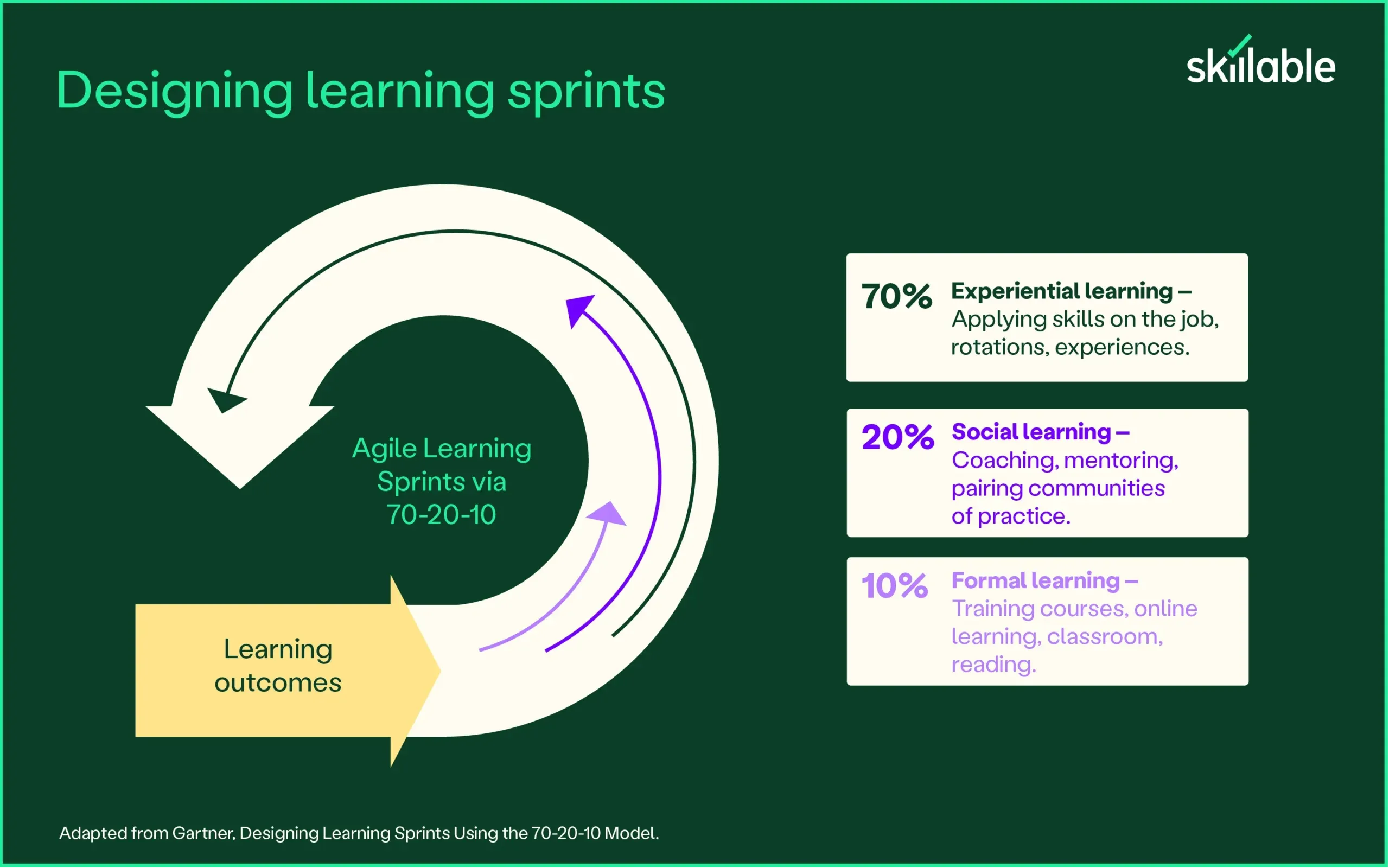 Gartner takes the 70-20-10 model a step further with a sprint framework that takes a specific outcome-based learning objective (think: building generative AI prompt engineering skills) and then designs a mix of learning experiences that match both the ratio and the outcome.