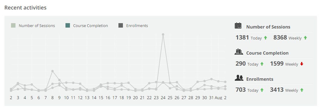 The widget blends various LMS metrics — from the number of active users, access frequency, and action counts, to course-completion rates.