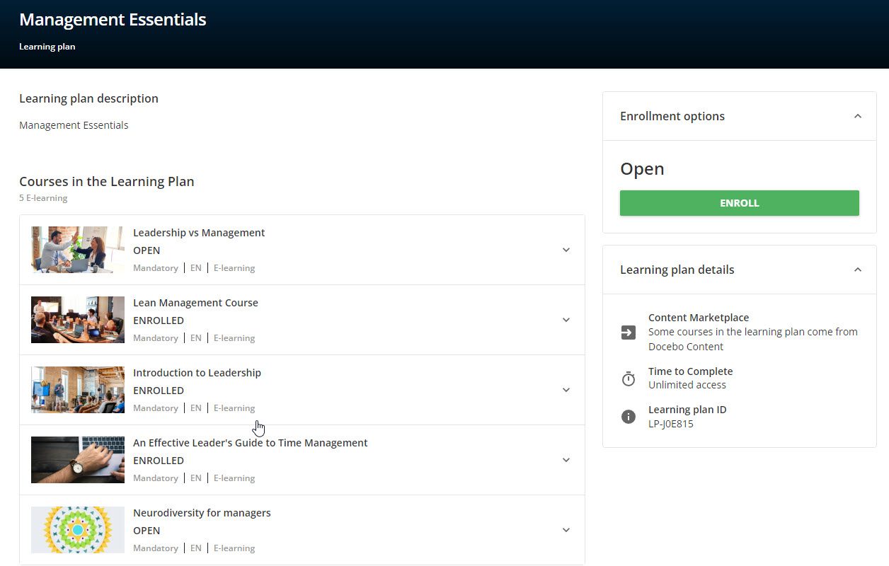 Tip: With Docebo’s Learning Plans, admins can easily map out a structured learning pathway for each learner — comprising a curated selection of courses and learning objects.