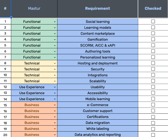 To help you navigate this process, we’ve created a comprehensive LMS requirements checklist. Use it to quickly compare how various LMSs fit your organization’s needs. Feel free to add your own items and adjust the categories.