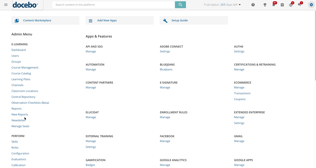Docebo also integrates with a multitude of other onboarding tools, covering content and course authoring, sales, marketing CRM, video communications, analytics, and SSO platforms.