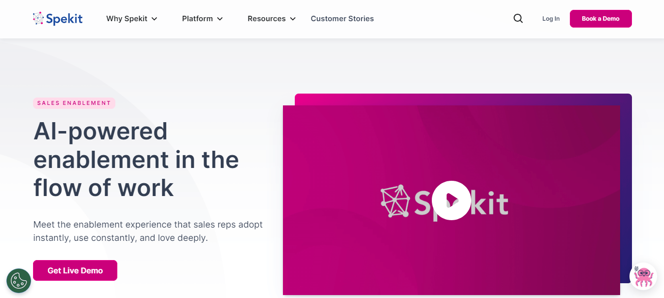 - Spekit AI—This includes AI-powered content recommendations, which automatically surfaces case studies and data reps need to close deals, and AI-powered content creation and summarization, which instantly generate baseline content for playbooks and trim lengthy SOPs into digestible sections.