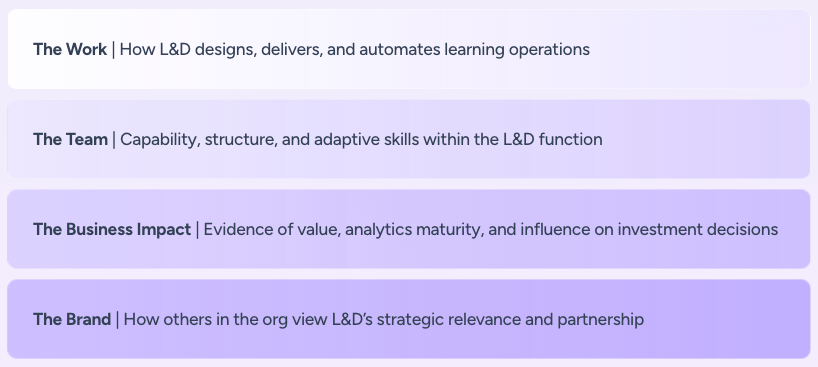 Although every organization faces its own challenges, our industry research and stakeholder conversations uncovered four core dimensions where leaders in learning organizations often focus their attention. These dimensions describe how L&D excels at delivering business value: L&D’s Work, Team, Business Impact, and The Brand.