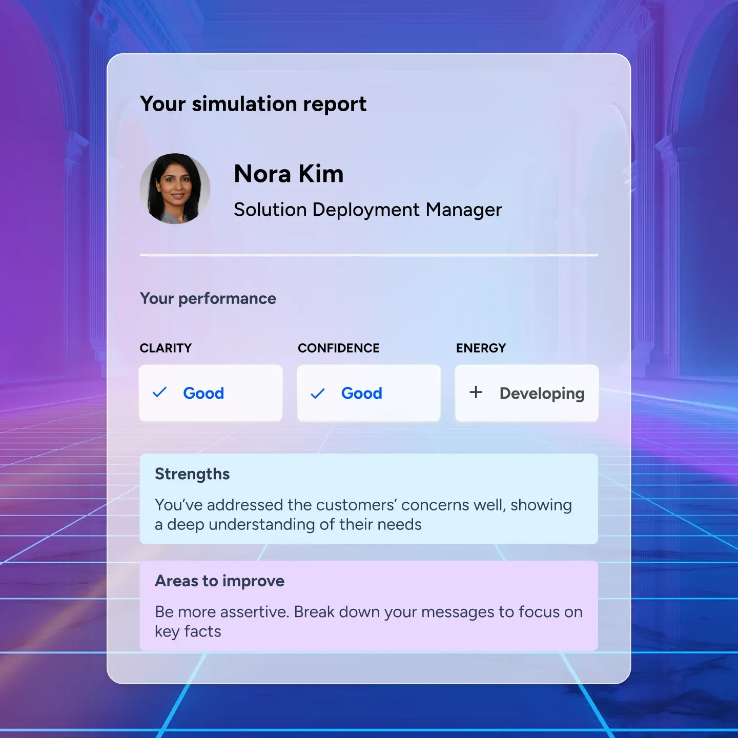 Docebo AI Virtual Coaching makes training impact measurable. Learners receive real-time, AI-generated feedback on critical soft skills such as clarity, confidence, tone of voice, and assertiveness—helping them continuously improve. They can also access and review past simulations anytime, enabling reflection and growth over time.