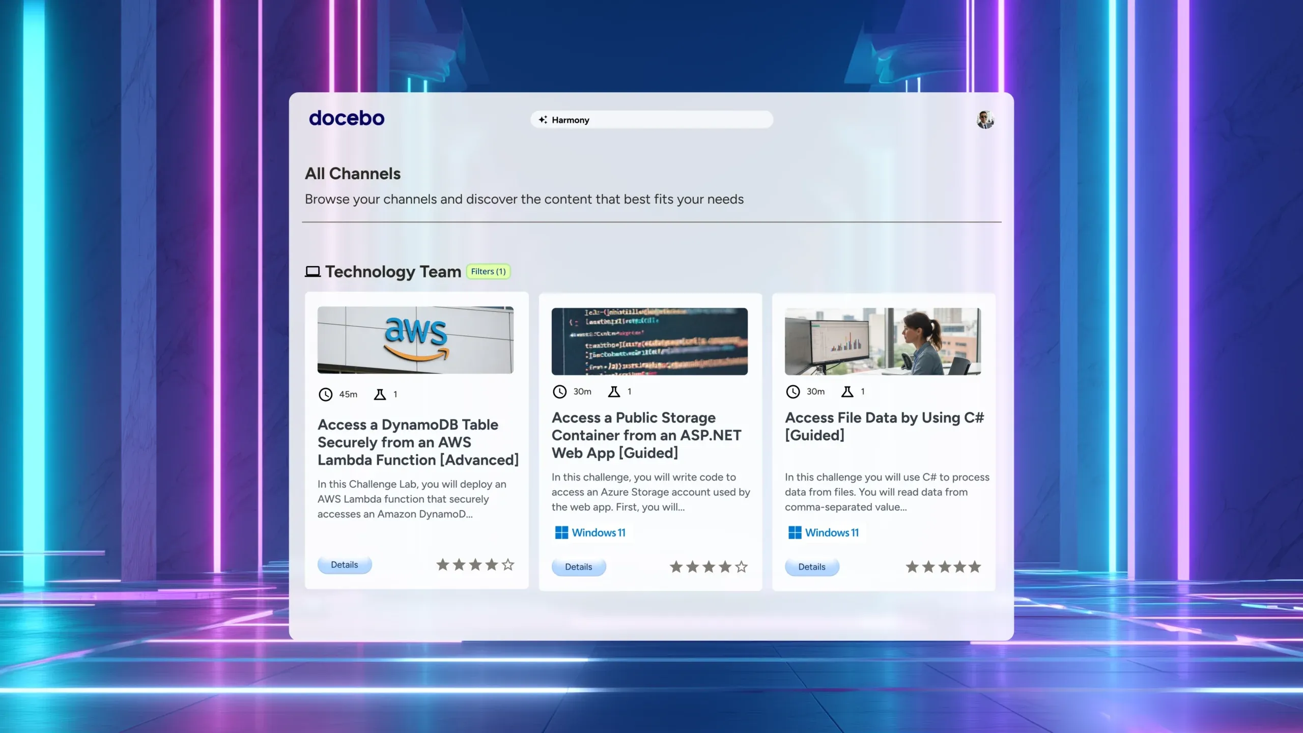 You get access to over 1,200 ready-made Challenge Labs across cloud platforms, cybersecurity, DevOps, automation, programming, data, AI, and end-user productivity. These labs are scenario-based, performance-scored, and ready to launch from Docebo, giving you immediate coverage for in-demand technical skills.