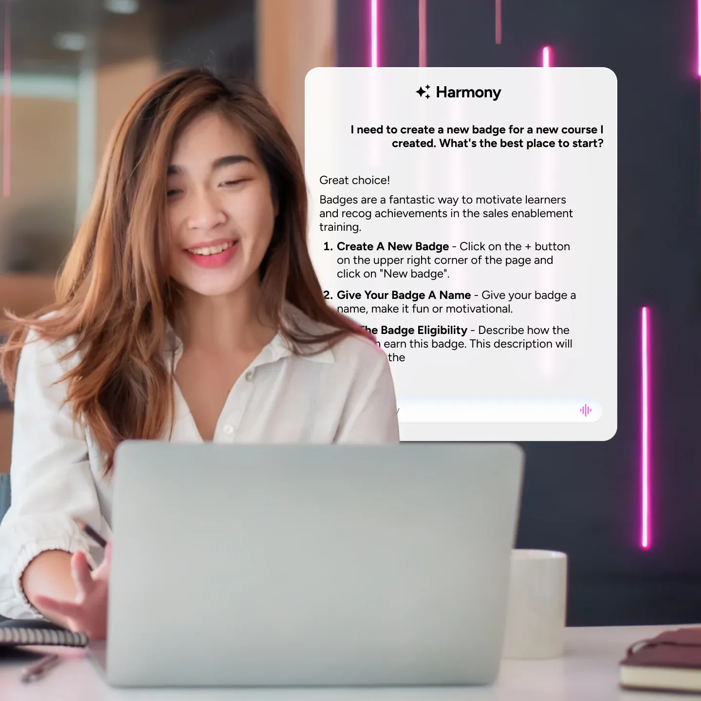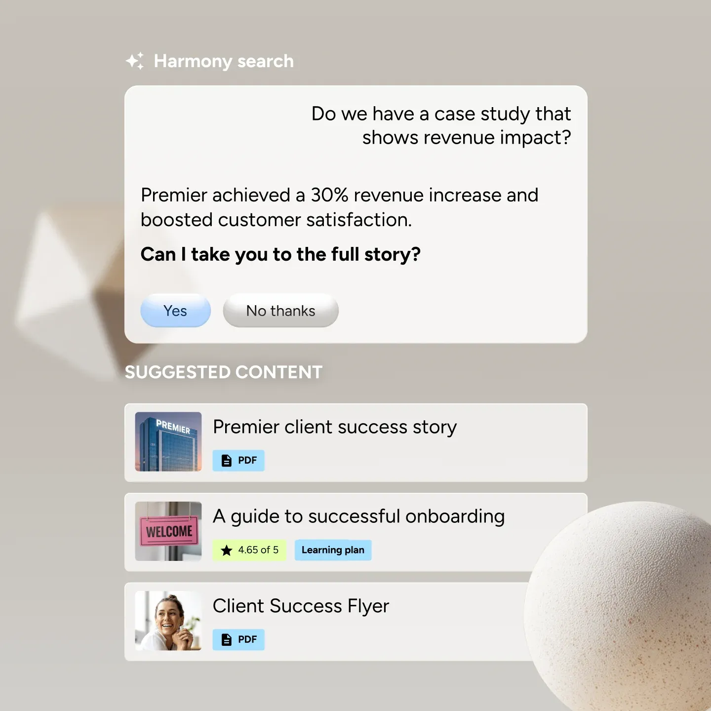 Spend time learning, not searching. Harmony finds what you need and boosts engagement with semantic search and personalized recommendations. No filters or keywords.