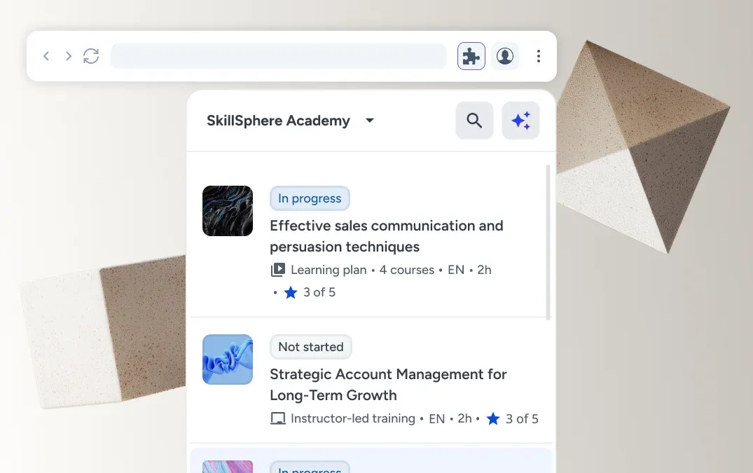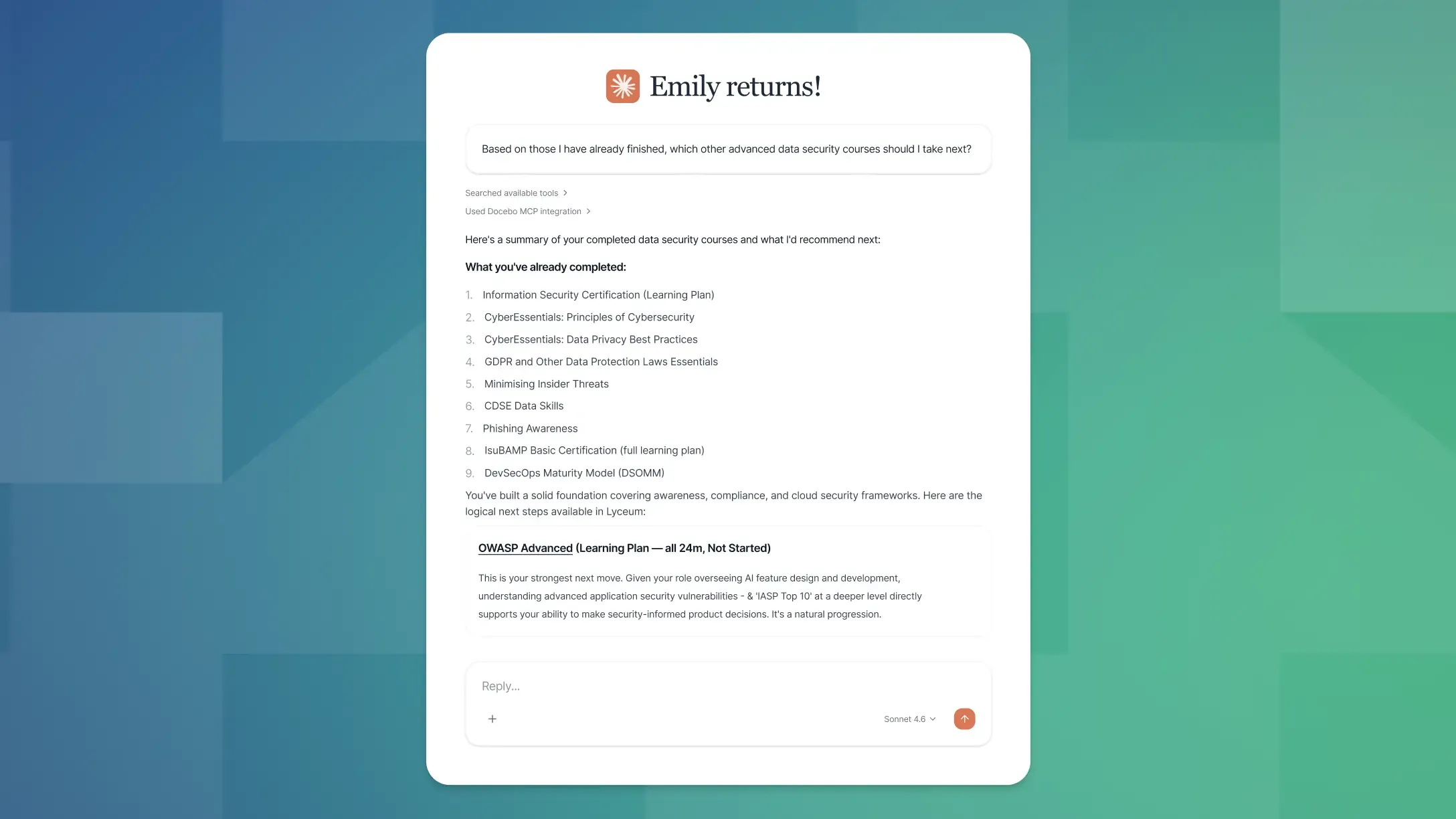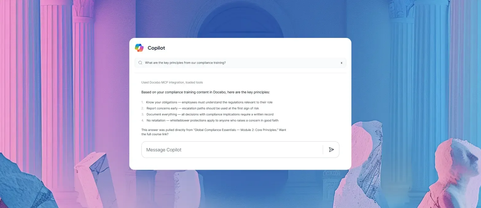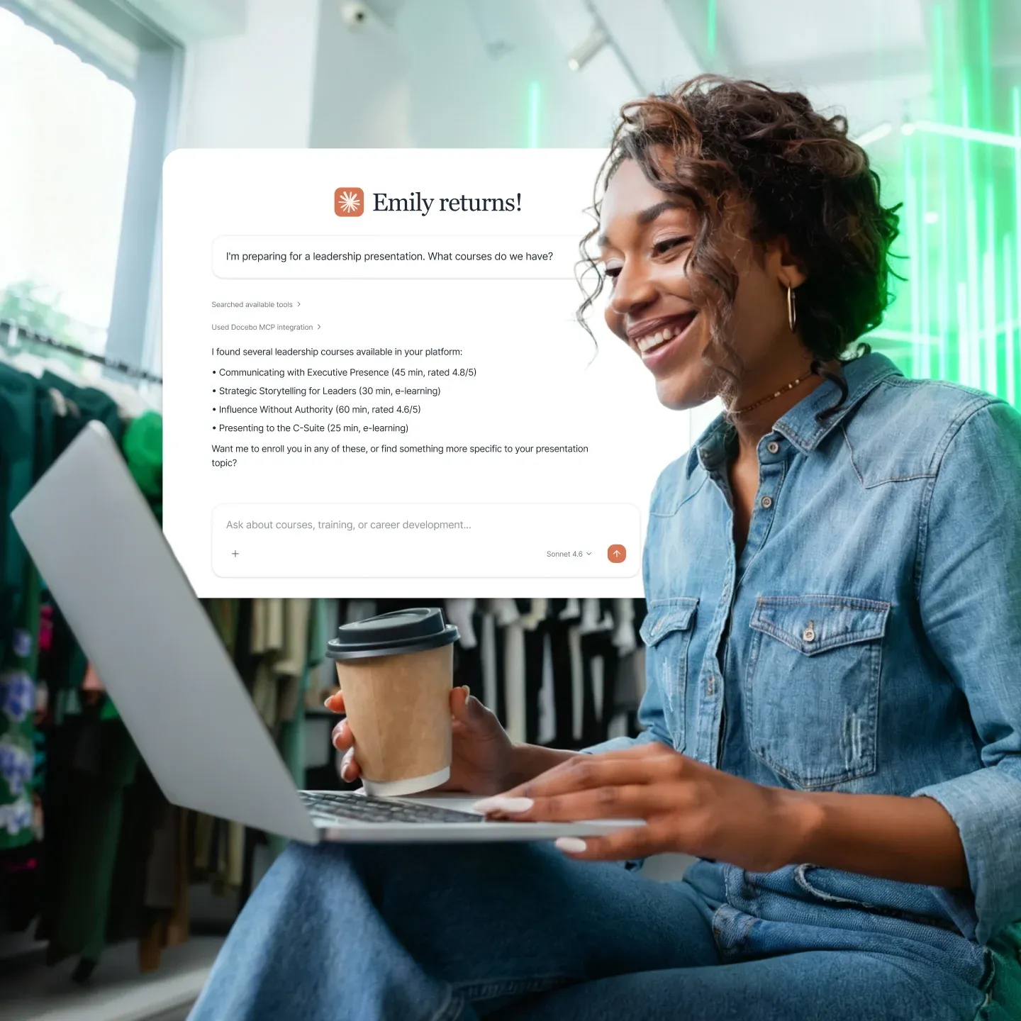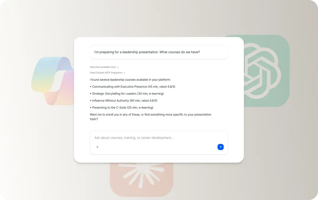 Learners get answers from Docebo without leaving Claude, ChatGPT or Microsoft Copilot. The training they need surfaces exactly where they’re already working.