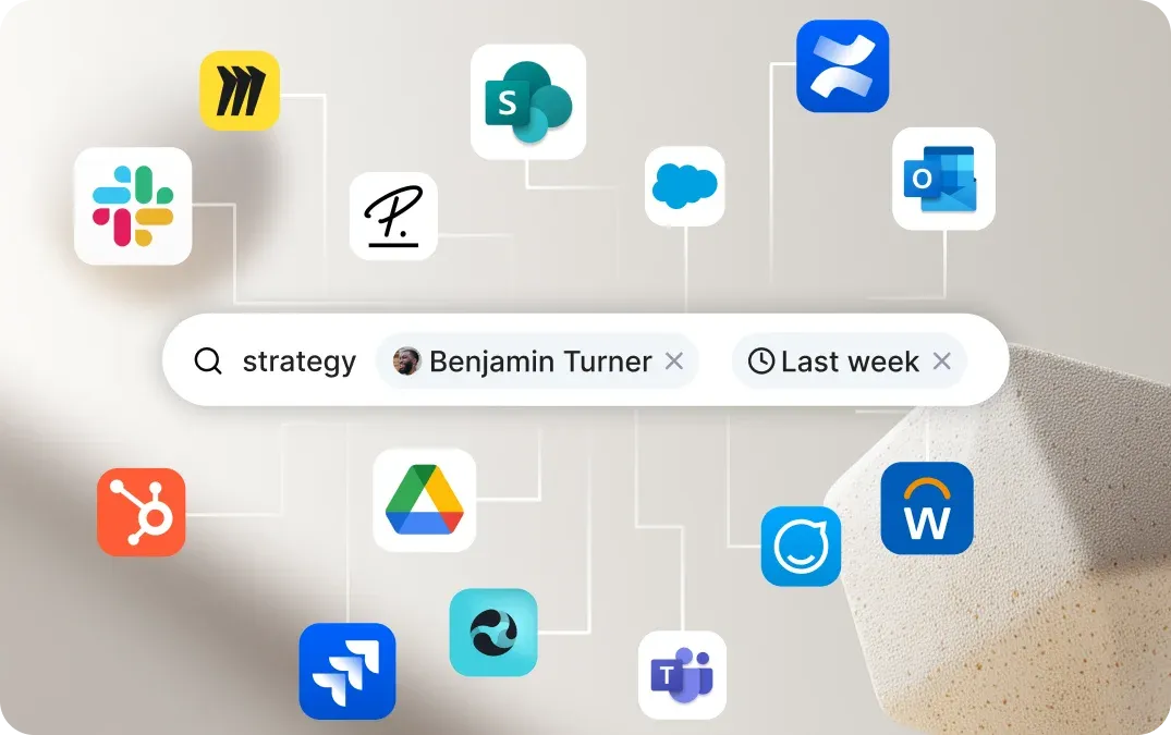 Search across Docebo, SharePoint, Confluence, Drive, Slack, and 25+ other places your org stores knowledge.