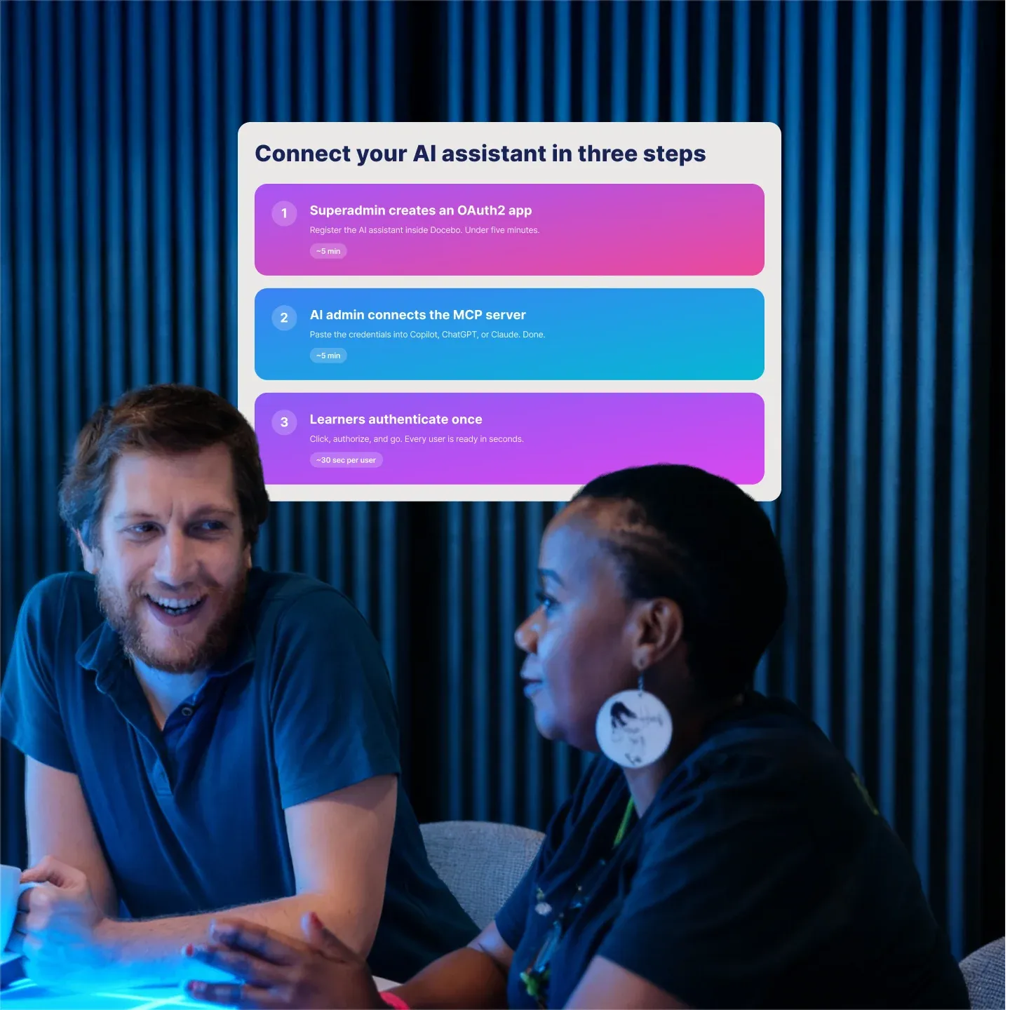 A Docebo Superadmin handles the one-time platform configuration. The administrator of your AI assistant connects the MCP Server on their end. From there, learners can authenticate themselves in under a minute.