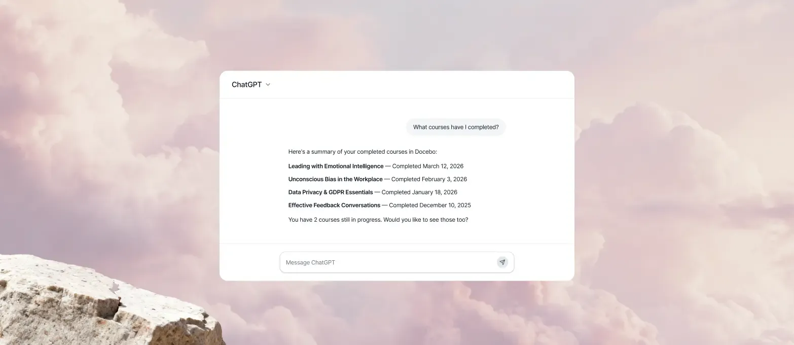 Docebo MCP Server is an integration that connects your LMS to AI assistants like Claude, ChatGPT, and Microsoft Copilot using the Model Context Protocol standard. Learners can check course progress, search training content, and track certifications directly in their AI assistant—without opening the LMS or switching tools.