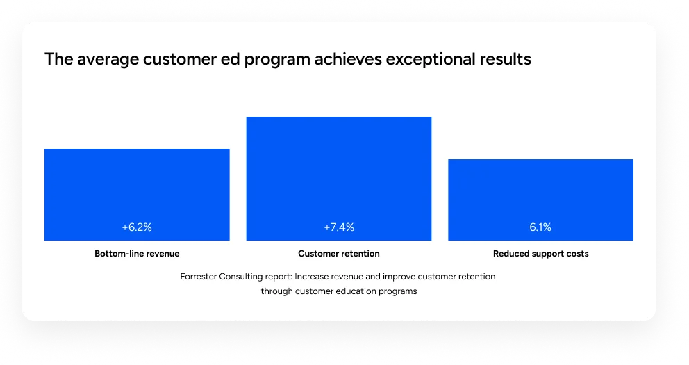 The numbers don’t lie. Customer education is a money-maker on both sides of the profit equation: It increases revenue and reduces costs. These impacts are also easy to measure and attribute because they connect to stats every business is already monitoring: Customer attrition, NPS, revenue, support costs, etc.