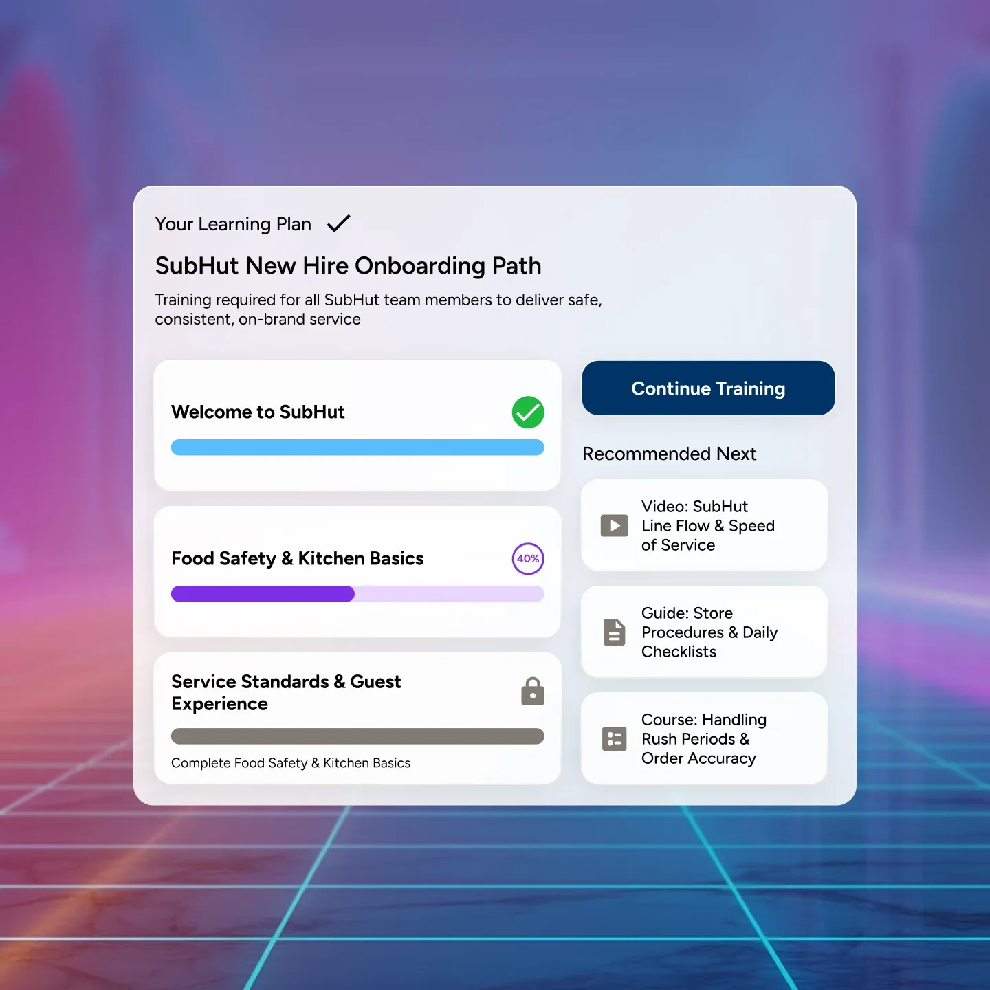 Deliver consistent, branded training across each location. Customize each experience while keeping standards, content, and reporting centralized in a single platform.